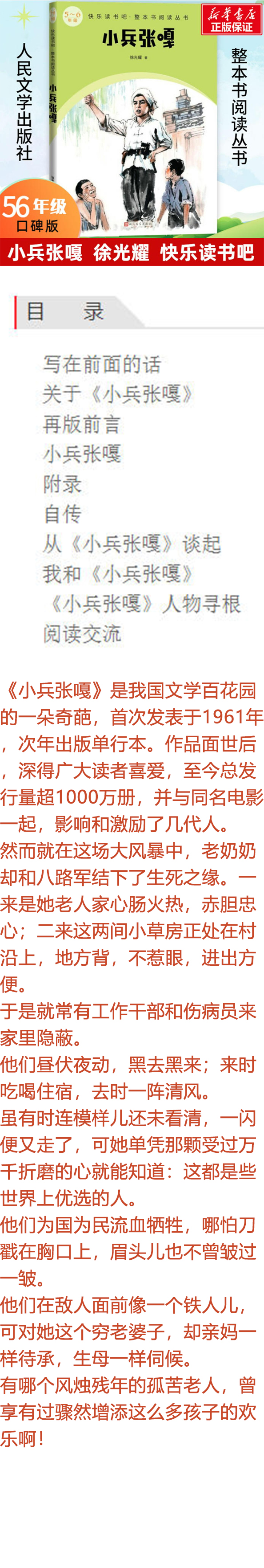 ★ 广泛传阅、家喻户晓的传世经典,累计发行量逾1000万册 ★ 中宣部、***等五部委选为“百种爱国主义图书”之一 ★ 同名电影获得巨大成功,被***等多部门列为“百部爱国主义影片”之一 ★ 2022年版义务教育语文课标“整本书阅读”任务群建议阅读图书 ★ 收入著名著名画家韩伍先生精美插图20余幅,并有作者徐光耀先生亲笔题签 ★ 附录作者自传和谈《小兵张嘎》创作文字若干供拓展阅读