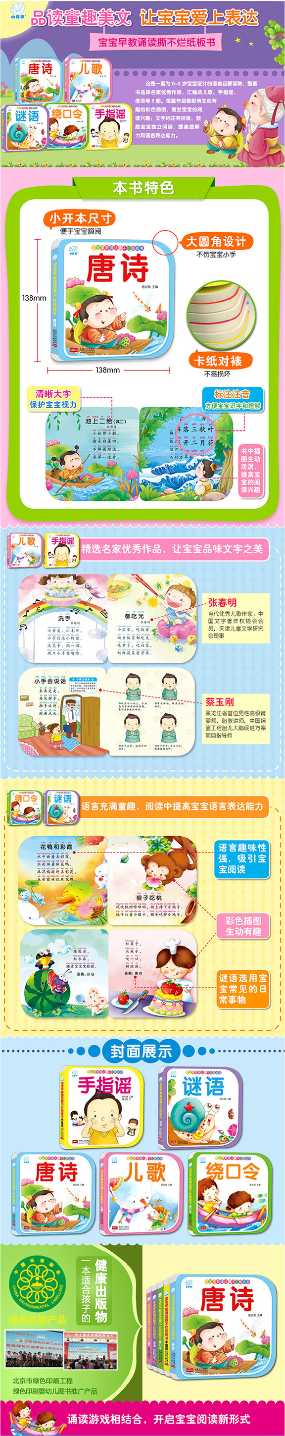 《宝宝早教诵读撕不烂纸板书》共5本,包括《儿歌》《谜语》《绕口令》《手指谣》《唐诗》。五本书的文字内容简短有趣,并标注拼音,配图精美,锻炼幼儿的语言表达能力,适合幼儿早期阅读。