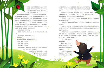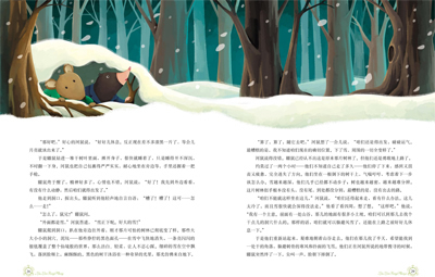 “这太棒了!”他对A己说, “这比刷墙有意思多了!”太阳暖暖地照着他毛茸茸的身体,柔和的风轻轻擦拭着他汗津津的额头。他在深暗的地下住太久了,听觉已变得迟钝,乍听到鸟儿欢快的歌声,耳朵竟不由得一震。生命的喜悦在他心头洋溢,终于可以尽情享受春天,不用作什么扫除了!他兴奋地往空中一蹦,然后在草地上飞奔起来。