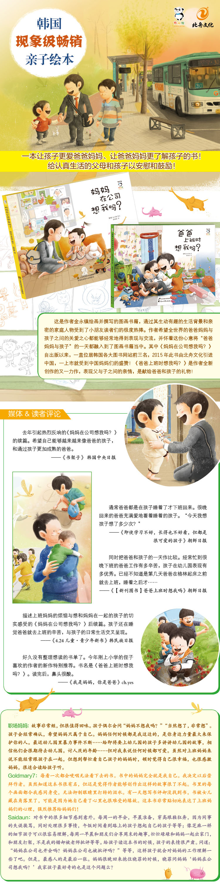 2、《妈妈在公司想我吗?》自出版以来,在韩国获得多项大奖,一直保持畅销纪录,引进中国后,受到中国妈妈们的欢迎。本书是作者金永镇全新创作的又一力作《爸爸上班时想我吗?》是献给爸爸和孩子的礼物!