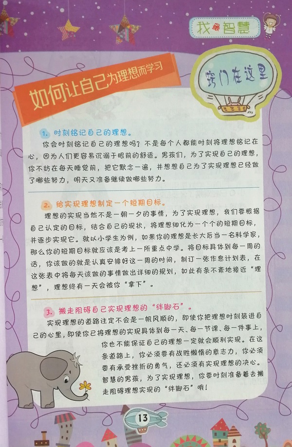 本书是著名儿童文学作家乐多多的新作。本册《我最智慧》以智慧学习为主题,讲述让男孩快乐考取100分的小窍门,是一堂关于睿智与学习的男孩必修课。这套书将趣味性与实用性结合,深入浅出地解读男孩成长中会遇到的问题,是男孩成长中的加油站,让男孩拥有自信、乐观、勇敢等优秀品质,成为最了不起的男子汉,适合小学高年级男生阅读。