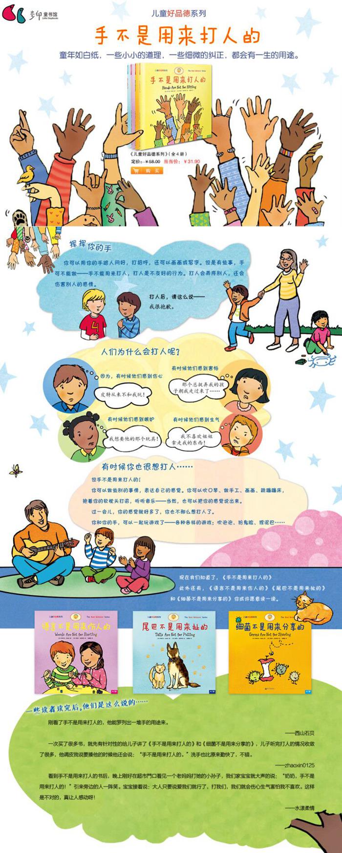● 手用来打人?还是用来帮助人?语言用来伤人?还是用来让彼此高兴?《手不是用来打人的》《语言不是用来伤人的》,靠诉儿童与外界交流的基本准则,让儿童与外界的交流,畅通无碍。
