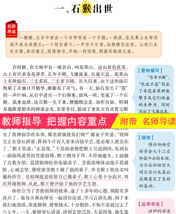 ★【人生***书】 权威语文专家,一线教师全程阅读指导,名师点评,精美手绘,妙笔生花,精选*适合孩子们阅读的故事书,在这个成长的季节里,让我们阅读这些永恒的经典,让书籍成为孩子的领跑者..阅读这些经典作品,使童年的阅读成为一生永远的快乐. ★【大收获】 一线教学专家 资深班主任 优选优编 同步知识要点 阅读提示理解=大收获 ★【精美手绘插图】 根据文章配上精美的手绘彩图,让阅读不再枯燥无味,让孩子们兴趣盎然,增加了主人公的立体形象,让阅读更加生动有趣。 ★【无障碍阅读】 无障碍阅读,名师详细的注释与精评会让名著回归它人生成长导师的根本功能!重难点字词注释,帮助学生理解与学习;详尽又通俗的译文,引导学生快速掌握文章内容;提升学习兴趣,享受快乐阅读的时光. ★【名家导读】 名师导读:帮助学生了解文章内容,提高阅读兴趣.阅读理解:根据内文分析,引导学生深入思考,提升理解能力.名师点拨:分析内容及写作手法,让学生掌握重点.回味思考:提出有针对性的问题,让"读"与"想"紧密结合. 《西游记》不仅有较深刻的思想内容,艺术上也取得了很高的成就。它以丰富奇特的艺术想象,生动曲折的故事情节,栩栩如生的人物形象,幽默诙谐的语言,构筑了一座独具特色的《西游记》艺术宫殿