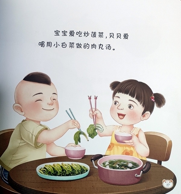 《好好吃的蔬菜》:青蛙呱呱带熊猫咪咪去菜园看人们种植、用来食用的蔬菜,他们看到了番茄、辣椒、黄瓜、茄子等美味的蔬菜。从菜园回到青蛙呱呱的家时,池塘里开满了美丽的荷花。