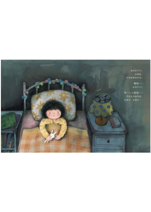 作者根据自己童年时怕黑、不敢独自睡觉的经历创作了这个故事,表达了要尊重儿童的想象力和恐惧感的立场,并用一个温暖的故事结尾鼓励孩子去战胜心中的恐惧。插画师根据故事提炼出两种画面体现形式——“虚”与“实”。“虚”来自故事中小女孩处于黑暗的状态里,对想象中黑夜的恐惧,臆想出各种恐怖元素的心理。“实”一来自夜晚状态下的实物,楼房和树木、灯光等;二来自妈妈进屋在身边获得的安全感。 插画师把虚实穿插在每一面的画面关系中。在处理“虚”时,运用较多水彩笔触的渲染。处理“实”时,则运用更丰富更明亮的颜色。在最后一个大画面中,“虚”和“实”紧密结合,小女孩想象中夜鸟的形态和她所生活的环境融合在一起,把故事推向了高潮。这本书对家长会有一定的启发作用:当自己的孩子害怕某一件事情时,应该先站在孩子的角度去接纳孩子的感受,然后慢慢引导和鼓励孩子战胜恐惧,帮助孩子成长。