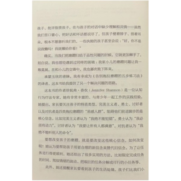 看看你属于哪一型? 1 追求卓越、担心犯错的完美主义者 5 追逐刺激与挑战、讨厌无聊的勇士 12 试图让所有人都满意的讨好者 18 不愿听从别人安排的对抗者 23 为什么拖拉磨蹭顽疾难除? 29 你头脑中的某些信念在捣乱 31 完美主义者——“犯错等于失败” 31 勇士——“我必须有动力” 34 讨好者——“绝不能令人失望” 37 对抗者——“绝不能向他人屈服” 39 消极情绪和分心让你陷入恶性循环 42 彻底告别拖拉磨蹭的五步练习法 47 步 找到开始行动的动力 48 第二步 驾驭情绪波动 57 培养新信念 57 巩固新信念 67 第三步 消除干扰不分心 73 第四步 把任务变得可行 79 分解任务 79 争分夺秒 84 保持进度 90 第五步 为应对批评做准备 98 射中靶子,而不必正中靶心 106 结语 117