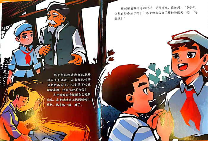 《闪闪的红星》(绘本)改编自作家李心田的同名小说《闪闪的红星》。故事的主人公潘冬子成长在革命的家庭,很小的时候,父亲就离开家乡参加了红军的队伍,母亲入党后在家乡柳溪村掩护赤卫队和游击队开展斗争。旧社会苦难的压迫和父母不屈不挠的斗争激励了潘冬子。他富有革命理想、战斗精神,和恶霸胡汉三机智勇敢地周旋。在宋爷爷的抚养和党组织的照顾下,历尽了千辛万苦的潘冬子最终找到了革命队伍,走上了新的征途。潘冬子机智勇敢的小英雄形象深入人心,成为一个时代的经典