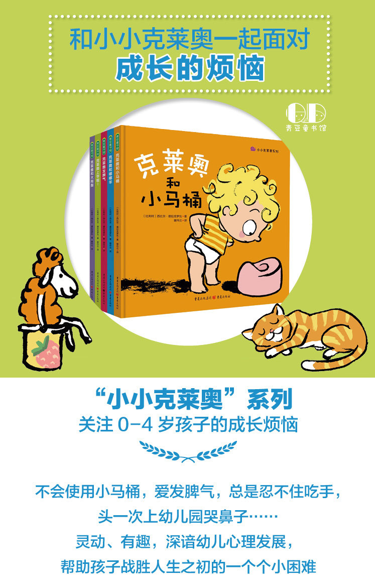 “小小克莱奥系列”原版由法国著名儿童出版社bayard策划出版,每本书以幼儿成长中觉的问题为主题,准确把握幼儿心理,陪伴孩子一起面对成长中的难题。细节生动有趣,画面精美活泼,很好地满足了0-4岁幼儿的发展需要。24开的小巧开本,为保护宝贝小手而做的圆角设计,不易污损的用纸,让宝贝的阅读体验更加完美。
