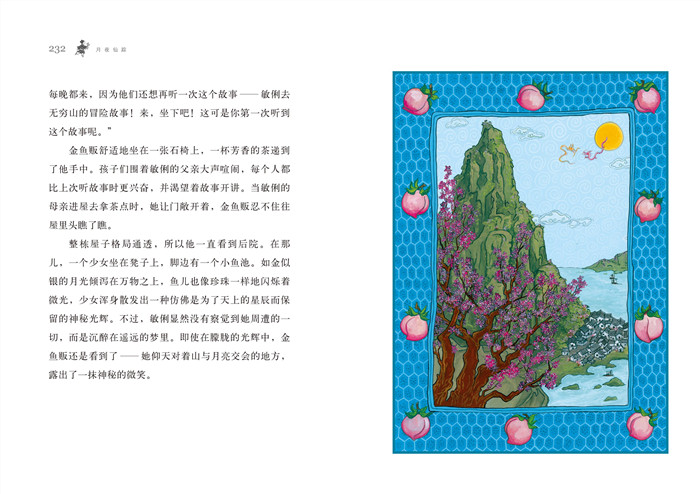 纽伯瑞儿童文学奖评委会这样评价《月夜仙踪》:“一幅由许多故事荟萃而成的缤纷织锦画,既是原创,又承袭传统,将读者带到一个奇妙的世界,在那里,龙加入了敏俐为改变命运而踏上的追寻之旅。”小说主人公敏俐为了改变家庭和家乡的贫穷状况,离家寻找无所不知的月下老人,一路上她遇到了会说话的金鱼、不会飞的祥龙、善良的牧童、机敏的大阿福姐弟、月中的白兔等神奇的朋友,经历了跌宕起伏、险象环生的遭遇,还听到了许多充满了欢笑与泪水的故事。作者林珮思从中国传统民间故事中取材,经过极富想象力的加工和独具匠心的精妙布局,将这些小故事如珍珠般串在叙事主线上;同时,作为绘者的林珮思为每一章节、每一个故事设计了优美的插图,并为整本书贡献了美轮美奂的封面,从视觉上呈现给读者一个极具“中国风”的奇幻世界。这本被美国读者和书评界誉为亚洲版《绿野仙踪》的小说,通过精彩的故事与精美的插图,还让读者体会到贪婪的邪恶、亲情和友谊的温暖,以及感恩的喜悦。