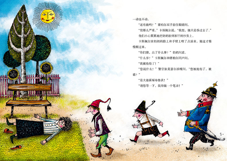 卡斯佩尔和赛伯尔的故事是介于现实和魔幻之间的侦探故事,大盗霍琛布鲁茨对于自己做强盗没有任何的愧疚心理,所以,每次打劫都是那么轻松自如,得心应手,而且还乐此不疲。小卡斯佩尔是个不甘示弱的男孩,他和伙伴赛伯尔巧妙地设下一个又一个圈套来抓大盗贼,每次都得手,而大盗霍琛布鲁茨每一次总能从容化解,反将卡斯佩尔他们套住,不过卡斯佩尔他们却总能凭着勇敢和聪明,成功地逃脱。正是在这种斗智斗勇之中,卡斯佩尔他们和大盗霍琛布鱼茨最后成了好朋友,故事读来让你忍俊不禁,而其中配插的大量精美图画,无不充满童趣。故事曾多次改编成电影、电视剧和广播剧,先后被译成四十多种语言在全世界广为流传。