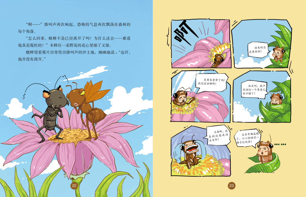 《圣甲虫——“淘金者的阴谋”》:圣甲虫粪粪团了一个大粪球,因为马上要下大雨了,他打算把粪球推到山坡顶上享用,可是坡太陡了,粪粪努力了几次,都失败了。就在粪粪精疲力竭、无计可施时,草丛中钻出来另一只圣甲虫——号称助人为乐的乐乐。在他的帮助下,粪粪把粪球推到了坡顶,正想饱餐一顿时,却发现了一个惊人的真相……