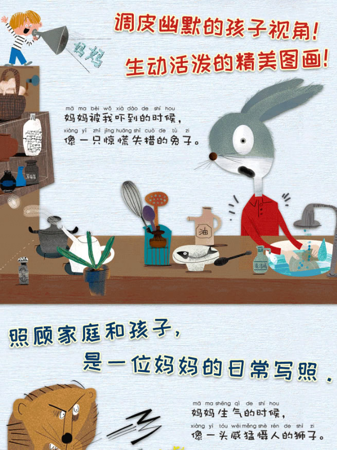 ◆从孩子的视角,用各种可爱的动物形象,贴切地描述了不同情绪下的妈妈的模样。