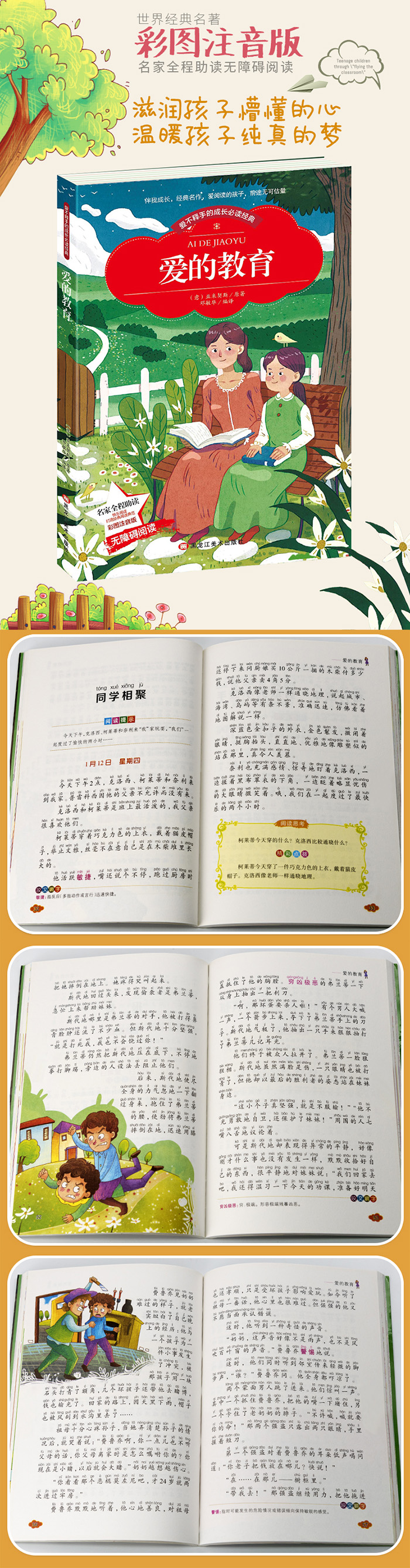 《爱的教育》是意大利作家亚米契斯在1886年写的一部儿童小说。这是一本日记体的小说,以一个四年级男孩恩利科的眼光,从4年级10月份开学的第一天,一直写到第二年7月份。记载了小学生恩利科九个月的四年级生活。爱是整篇小说的主旨,就在最平实的字里行间,融入了种种人世间最伟大的爱:老师之爱、学生之爱、父母之爱、儿女之爱、同学之爱,每一种爱都不是惊天动地的,但却感人肺腑。整部小说以一个小学生的眼光审视着身边的美与丑、善与恶,完全在用爱去感受生活中的点点滴滴。