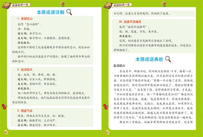 5.本系列图书囊括了人教版和苏教版小学1~6年级语文教材里收录的成语,并按照由易到难、由低年级到高年级的顺序进行编排。这样精心的设计实用、方便,非常适合小学生的实际需求。………………