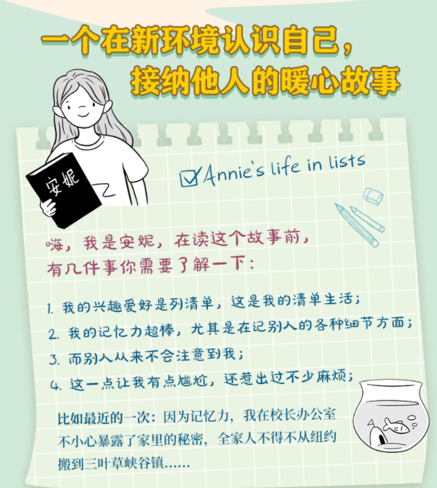 嗨,我是安妮,在读这个故事前,有几件事你需要了解一下: 1.我的兴趣爱好是列清单,这是我的清单生活; 2.我的记忆力超棒,尤其是在记别人的各种细节方面; 3.而别人从来不会注意到我; 4.这一点让我有点尴尬,还惹出过不少麻烦; …… 原本在学校没什么存在感的女孩安妮,突然成为大家瞩目的焦点——她被开除了!安妮不得不告别熟悉的生活和好朋友,跟家人一起搬到一个偏远小镇,那里的树林中有熊出没,漫山遍野都是三叶草,跟原先他们居住的大都市迥然不同。而这一切,都是因为她那麻烦的记忆力……