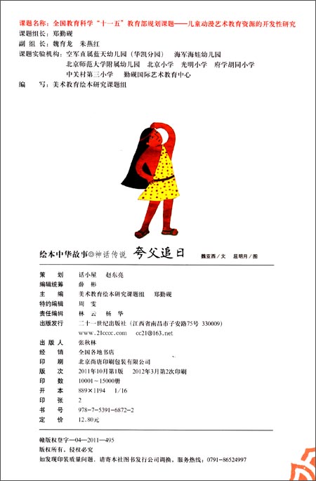 《绘本中华故事•神话传说:夸父追日》讲述了夸父是我国古代神话中的巨人,善于奔跑。他是后土娘娘的孙子,住在北方荒野的成都载天山上。夸父把两条黄蛇挂在耳朵上,作为耳饰。他与太阳赛跑,最终赢过了太阳。口渴的他喝干了黄河和渭河的水,在去更远的瀚海喝水的途中,他永远地倒下了。他的身体变成了一座山,这座山后来成为了夸父族人的新家园。