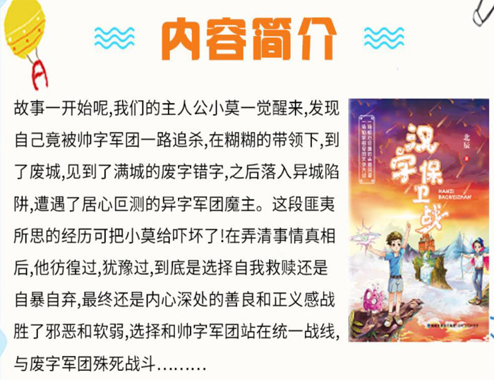 故事一开始呢,我们的主人公小莫一觉醒来,发现自己竟被帅字军团一路追杀,在糊糊的带领下,到了废城,见到了满城的废字错字,之后落入异城陷阱,遭遇了居心叵测的异字军团魔主。这段匪夷所思的经历可把小莫给吓坏了!在弄清事情真相后,他彷徨过,犹豫过,到底是选择自我救赎还是自暴自弃,最终还是内心深处的善良和正义感战胜了邪恶和软弱,选择和帅字军团站在统一战线,与废字军团殊死战斗……