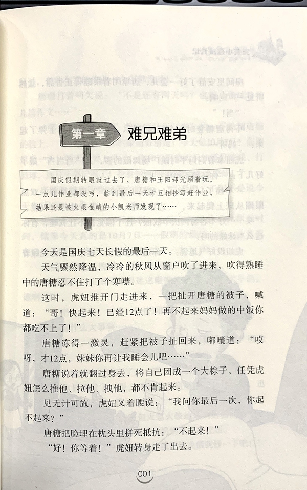 第一章 难兄难弟 国庆假期转眼就过去了,唐糖和王阳却光顾着玩一点儿作业都没写,临到最后一天才互相抄写赶作业。结果还是被火眼金晴的小凯老师发现了…… 今天是国庆七天长假的最后一天。 天气骤然降温,冷冷的秋风从窗户吹了进来,吹得熟睡中的唐糖忍不住打了个寒噤。 这时,虎妞推开门走进来,一把扯开唐糖的被子,喊道:“哥!快起来!已经12点了!再不起来妈妈做的中饭你都吃不上了!" 唐糖冻得一激灵,赶紧把被子扯回来,嘟囔道:“哎呀,才12点,妹妹你再让我睡会儿吧……” 唐糖说着就翻过身去,将自己团成一个大粽子。任凭虎妞怎么推他、拉他、拽他,都不肯起来。 见无计可施,虎妞叉着腰说:“我问你最后一次,你起不起来?" 唐糖把脸埋在枕头里拼死抵抗:“不起来!”“好!你等着!”虎妞转身走了出去。