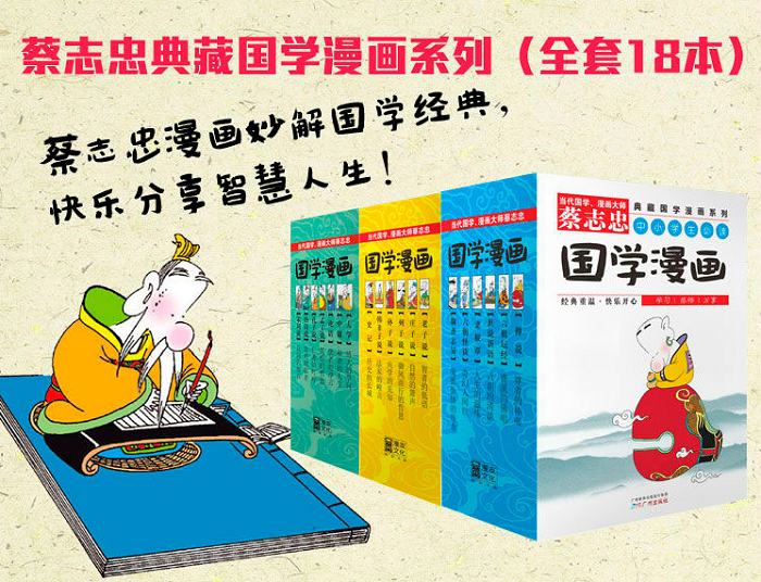蔡志忠典藏国学漫画系列(全套18本)是全球*授权彩色版,全套18本首次集结!蔡志忠典藏国学漫画系列(全套18本)已被列入2013中小学“学习图书推荐”名单,中小学生必读国学漫画*!国学、漫画双料大师蔡志忠被誉为“当代漫画新国学*人”,素来以行云流水般的笔触和睿智幽默的圣贤解读闻名于世,其漫画不涉及意识形态而更偏向于个人学习和修养,以其对国学的独到心得,将经典白话化与漫画化,并加以现代诠释,使读者能通过其简洁生动的线条描绘出的国学漫画去认识传统文化。蔡志忠国学漫画已经发行到45个国家和地区,全球销量超过40,000,000册,对中国漫画以及中华传统文化的国际传播,极大地推动了本土原创和新国学的双向发展!