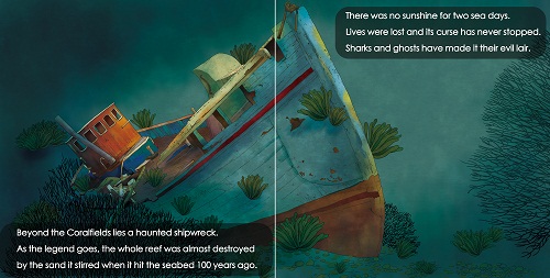 在珊瑚田的那边,有一艘闹鬼的沉船。传说,一百年前它落到海床时激起的沙几乎毁掉了整个珊瑚礁。两天内,海里没有透进一点阳光。无数鱼儿丧命,它的诅咒到现在还没有停止。鲨鱼和幽灵已经把那里当成了他们的老巢。