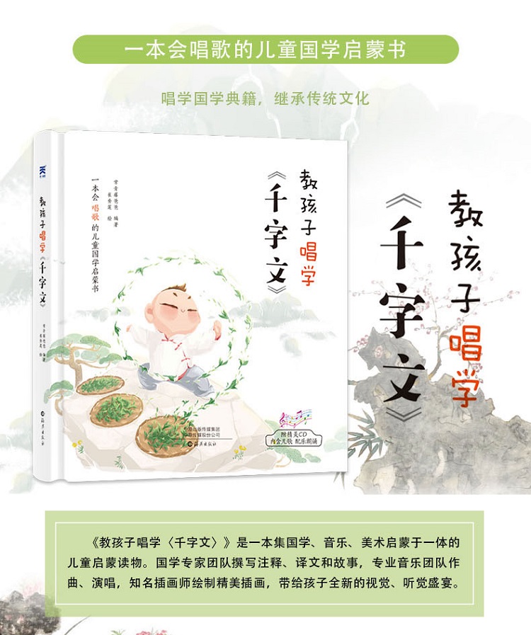 《教孩子唱学<千字文>》是一本集国学、音乐、美术启蒙于一体的儿童启蒙读物。全书将《千字文》分为34段,分段讲解,国学专家团队撰写注释、译文、典故和知识点;专业音乐团队作曲、演唱,将《千字文》歌曲分为5段,有儿歌、有朗读,便于孩子聆听;知名插画师绘制精美插画,带给孩子全新的视觉、听觉盛宴,让孩子在快乐的氛围中唱学《千字文》,完成国学经典启蒙。