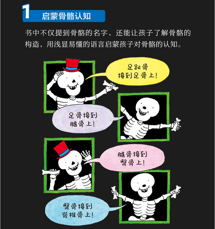 本系列图书讲的是一个大骷髅人和一个小骷髅人还有一只骷髅狗的趣味故事。故事文字简单,朗朗上口,便于孩子理解。图画干净利落,是骨骼启蒙书非常不错的选择。在大骷髅人、小骷髅人和骷髅狗的日常故事中展现情节与语言上的幽默性,有助于5-10岁的儿童学习基础词汇与句型,学会欣赏和使用韵律,学习拟声词及标点符号的使用。通过本书,可以让孩子初步了解骨骼,并绘制和标记人类/动物骨骼。图画方面,黑底与白色的大面积运用有助于形成对比,并引入黑夜与白天的话题讨论。同类图书有“骷髅狗”“飘着幽灵的小房子”“植物大战僵尸 科学漫画系列”等。