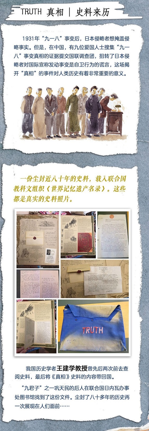 这个故事是面向4-8岁孩子的历史绘本。故事的历史史料现藏于联合国日内瓦图书馆,我国著名历史学家王建学教授先后两次到日内瓦,查阅并将《真相》史料的图片带回了中国。这个故事完整再现了1931年中国“九君子”向国联递交日军发动九一八事变的真实证据的事件过程,扭转了日本侵略者对国际宣称发动事变是自卫行为的谎言,这场揭开“真相”的事件对人类历史有着非常重要的意义。《真相》史料的搜集、整理、递交的过程中,中国人民、英国人民、爱尔兰人民联合捍卫了人类正义,才使这段历史被以正视。