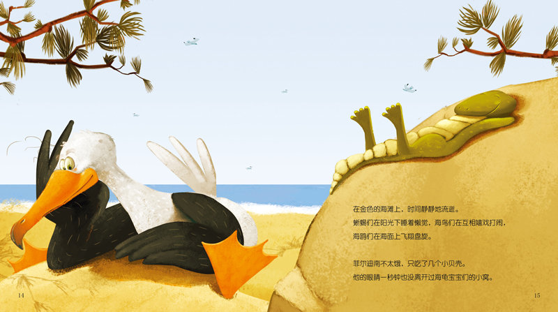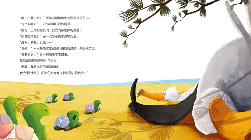 海龟阿芒蒂娜从远方来到一片沙滩上孵蛋,她知道宝宝们在沙滩上会遇到很多危险,因为海鸟、螃蟹和蜥蜴都喜欢吃小海龟。幸运的是,善良的海鸥菲尔迪南像爸爸一样在旁边保护海龟宝宝们。那么,所有的小海龟最后都安全地回到大海中了吗?