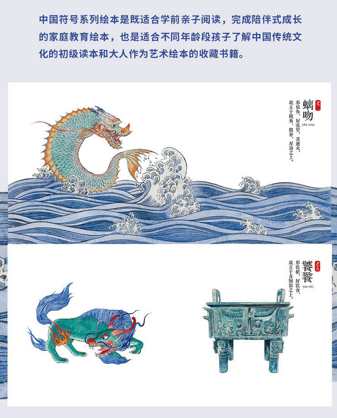 今天在中国大地上我们仍能寻觅到龙九子在建筑以及器物上的广泛应用。当我们的孩子在看到屋檐上的螭吻,不会误认为是条鱼。看到赑屃的时候,不会误认为是乌龟驮石碑。从小了解传统文化,热爱传统文化,传承东方智慧,增强民族文化自信,是中国符号系列绘本的目的所在,让我们的孩子不仅能观察看到的事物表象,同时也能感受到事物背后的文化内涵。