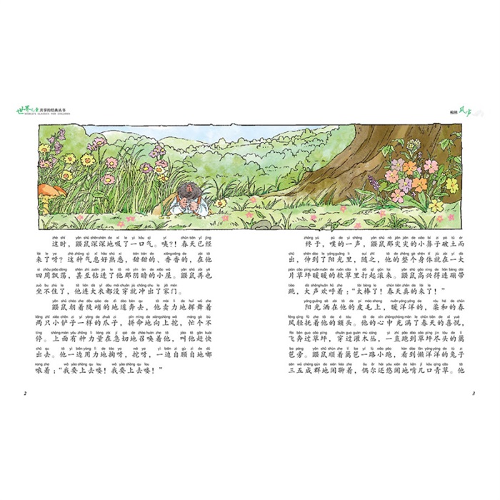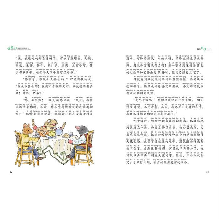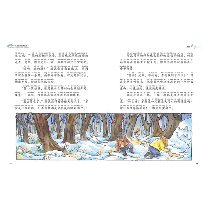 《柳林风声》是英国作家肯尼斯·格雷厄姆创作的童话,发表于1908年。它是一部以动物为主角、充满田园牧歌风情和生活哲理的妙趣童话,讲述了杨柳河岸、野树林中四个动物好朋友居家度日、外出游玩、离家历险,以及齐心协力保卫家园的故事。书中的小动物们形象鲜明、性格迥异,鼹鼠忠厚老实、热爱冒险,河鼠聪明机灵、侠肝义胆,老獾睿智持重、具有领导风范,蟾蜍虚荣浮夸、放荡不羁。他们快乐地生活在河岸与森林,团结友爱,互帮互助,整部作品充满自然的诗意与人性的温情。