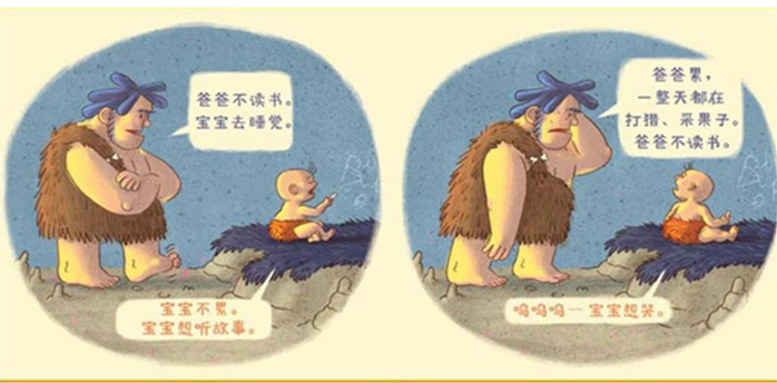 在很久很久以前…… 爸爸又是打猎,又是采果子,辛苦了一整天。 但他还是愿意为宝宝做任何事。 宝宝现在要睡觉了,他想要什么呢?一本书。一本好大好大的书。可怜的爸爸!