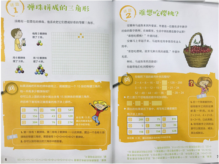 这是一套引进自法国的场景化解谜书,包含6大主题——《奇幻世界》《妙趣童年》《数学王国》《古代文明》《神秘宇宙》《绿色星球》,旨在全方位提升小学生的思维力——理解力、观察力、空间力、逻辑力、推理力、计算力、想象力等,以及在历史人文、天文地理和生态环保领域的学科素养。 每本书包含50道谜题,每5~8个谜题的答案能够引导孩子解决一个“终极谜团”。每个谜题都从一个真实或虚构的场景出发(从针对低年级的童话故事和神话传说,到针对高年级的天文地理知识),提出问题。孩子既可以通过阅读-观察-分析-推理独立解决问题,也可以在提示或成人的帮助下推导出答案。 《数学王国》旨在强化孩子对加减乘除运算、比例、面积、序列等的掌握。