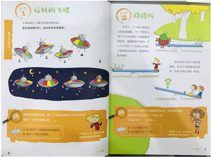 这是一套引进自法国的场景化解谜书,包含6大主题——《奇幻世界》《妙趣童年》《数学王国》《古代文明》《神秘宇宙》《绿色星球》,旨在全方位提升小学生的思维力——理解力、观察力、空间力、逻辑力、推理力、计算力、想象力等,以及在历史人文、天文地理和生态环保领域的学科素养。 每本书包含50道谜题,每5~8个谜题的答案能够引导孩子解决一个“终极谜团”。每个谜题都从一个真实或虚构的场景出发(从针对低年级的童话故事和神话传说,到针对高年级的天文地理知识),提出问题。孩子既可以通过阅读-观察-分析-推理独立解决问题,也可以在提示或成人的帮助下推导出答案。 《奇幻世界》让孩子们沉浸在一个奇幻的宇宙中。在这个宇宙中,孩子需要运用他们的逻辑思维,解出精灵、半人马和女巫的谜题。谜题以观察类为主,运算类为辅。
