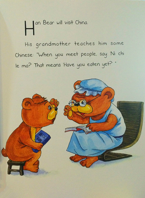 Han Bear will visit China. His grandmother teaches him some Chinese: “When you meet people, say ‘Ni chi le ma?’ That means ‘Have you eaten yet?’” Han Bear begins practising... but soon finds that some things have changed in China since Grandmother's day.