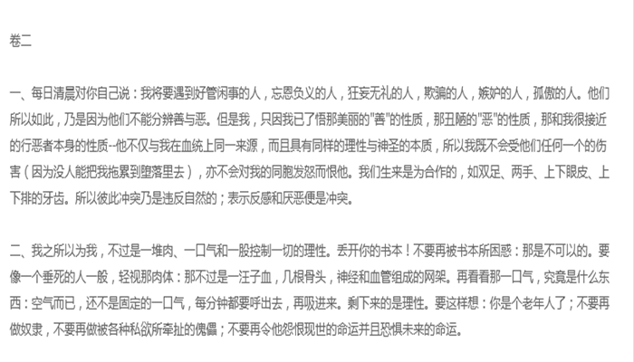《沉思录》是古罗马皇帝玛克斯·奥勒留写给自己的反省笔记,也是一部关于人生与自然哲学的思考录,大部分是在政事与战事的暇隙所写。全书以前后没有联系的箴言体写就,分12卷,共497条。作者在书中阐述了灵魂与死亡的关系,解析了个人的德行、个人的解脱以及个人对社会的责任,要求常常自省以达到内心的平静,要摈弃一切无用和琐屑的思想、正直地思考。而且不仅要思考善、思考光明磊落的事情,还要付诸行动,是一些从灵魂深处流淌出来的文字,朴实却直抵人心。本书译者梁实秋,翻译语言流利,翻译功底较厚,对原著把握恰当,使读者更准确理解原著,具有一定的出版价值。