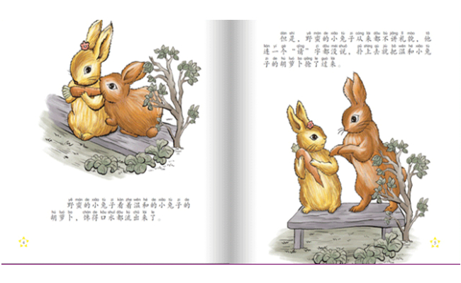 有一只温和的小免子,妈妈给他一根胡萝ト。没想到被一只野蛮的小免子发现了,这只尾巴向上翘着、胡须和爪子也透着野蛮的气势的免子抢走了温和免子的萝ト。野蛮地兔子正高兴地吃胡萝ト呢,恰好一个带枪的人走了过来,带枪的人发现了野蛮地兔子,而野蛮的小兔子根本不知道危险已经来了,结果被猎人一枪击。这只野蛮的兔子痛苦地逃跑了,但是,他已经没有了胡须和尾巴。