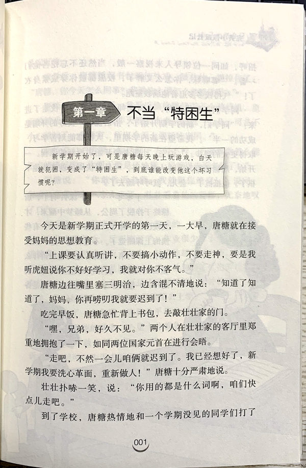第一章 不当“特困生” 新学期开始了,可是唐糖每天晚上玩游戏。白天就犯困,变成了“特困生”,到底谁能改变他这个坏习惯呢? 今天是新学期正式开学的第一天,一大早,唐糖就在接受妈妈的思想教育。 “上课要认真听讲,不要搞小动作,不要走神,要是我听虎妞说你不好好学习,我就对你不客气。” 唐糖边往嘴里塞三明治,边含混不清地说:“知道了知道了,妈妈,你再唠叨我就要迟到了!" 吃完早饭,唐糖急忙背上书包,去敲壮壮家的门。 “嘿,兄弟,好久不见。”两个人在壮壮家的客厅里郑重地拥抱了一下,如同两位国家元首在进行会晤。 “走吧,不然一会儿咱俩就迟到了。我已经想好了,新学期我要洗心革面,重新做人!”唐糖十分严肃地说 壮壮扑哧一笑,说:“你用的都是什么词啊,咱们快点儿走吧。”