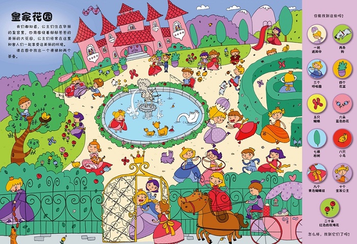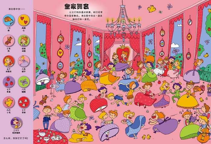 欢迎大家来到公主的世界,这本书将带领小朋友和家长一起穿越到童话故事中公主的世界。在这里,你将挑战1001个任务,孩子在公主的世界中了解皇家的礼仪、公主的生活等,会享受到很多乐趣。他们要找到很多东西,在皇宫中的花园里参加皇家舞会,拜访公主们的学校、参加睡衣聚会和皇家游行,我们还可以在公主们的厨房做一顿可口的饭菜,去跑马场参加马术比赛,和童话中的公主们做游戏。玩累了,我们还可以做些简单的游戏,比如画画、比眼力、找路线。这些都是小朋友们要完成的任务哦!