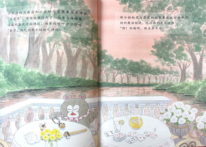 这是一本给4-7岁的孩子看的冒险童话,小熊厨师马露露和她的好朋友小蜜蜂马赛赛,告别春之女神与小狗们之后,顺着大河来到了一片开满鲜花的河岸边。马露露吃下了春之女神送给她们的魔法核桃中藏着的水果糖,身子居然变小了!魔法核桃则变成了魔法小船,载着马露露和马赛赛通过一条隧道,来到了一座美丽的池塘。在池塘里,她们遇到了一条孤单的小鲶鱼和一位自愿来陪小鲶鱼的女孩子,她们一块儿举办了一场美妙的音乐会。青蛙、蜗牛、蛾子等住在池塘附近的伙伴们也加入了进来,小鲶鱼不再孤单了。而马露露和马赛赛也终于回到了原来的家,她们的海滨餐厅也重新开始营业,并且加入了许多在冒险中得到灵感而开发的新菜目!