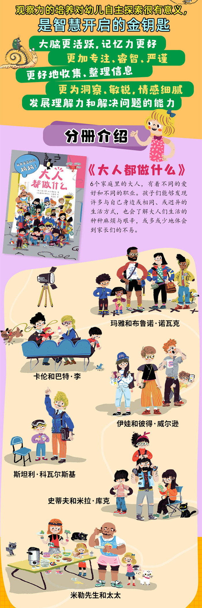 ★文字为简单而朗朗上口的韵体诗。 ★舒适的开本和漂亮、有趣、精细的插图是这套书的特色。 ★以2到6岁(或更大)孩子的口吻来讲述,即使蹒跚学步,也拥有非常好的观察力,并且能把自己观察到的,讲给大人。 ★书中有趣的故事不仅能让读者哈哈大笑,而且可以帮助小读者学习到很多知识,挑起他们对世界的兴趣。 ★书中的小游戏非常有趣,可以让孩童以一种愉快的、创造性的方式度过美好的阅读时光。 ★小游戏种类多样,能一遍一遍巩固提升孩子们阅读的兴趣,每个孩子都能拥有有序的归纳、整理信息的能力,面对多元的信息不会再变得碎片化或混乱不堪。