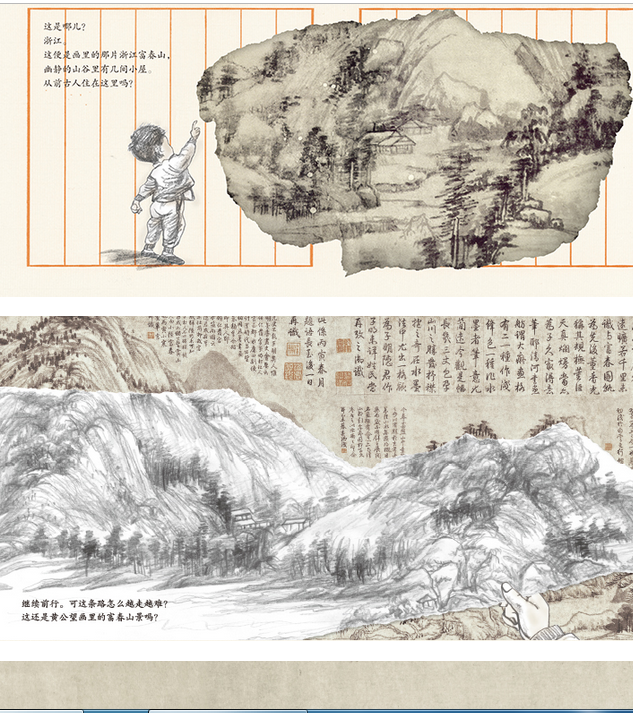 本书将小主人公“我”加入到传统中国画,以绘本构架方式,带领孩子自觉地走进富春山居图的世界。绘本以故事入手,将富春山居图打散、提取,用了中国画的表现形式,记录了小朋友在不同版本的富春山居图卧游的故事。