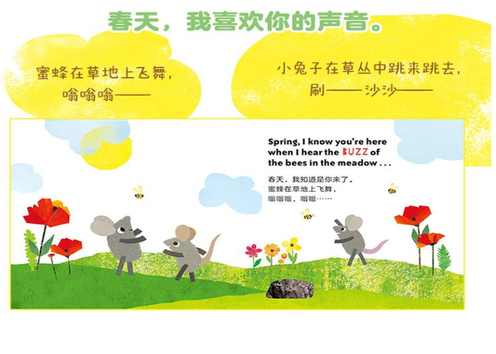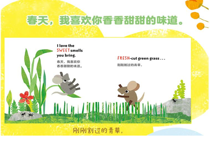 ☆《小黑鱼》作者李欧·李奥尼中英双语纸板书!春天来了,和田鼠阿佛一起去大自然里寻找春天的气味和声音,收集关于春天的词汇吧!简单而又富有节奏的英文短句,色彩明快的拼贴画,带孩子感受语言的乐趣。 ☆中英双语编排,选取生活中常用的基础英文单词,句子简短, 富有韵律和节奏,能激发儿童对语言单纯的听觉感受,有利于记诵。 ☆选取李奥尼绘本中的经典形象田鼠阿佛,综合运用拼贴、印染、剪纸、涂鸦等多种艺术手法再创作,让低幼的小宝宝也能感受大师作品的魅力。 春天到了。小树发芽,花开了,鸟宝宝在巢里叽叽喳喳。 春天,我喜欢你香香甜甜的味道。刚刚割过的青草,盛开的玫瑰,可爱的百合,还有下雨的味道。 我喜欢雨点啪嗒啪嗒落在我的鼻子上,喜欢双脚踩在泥土里咯吱咯吱的声音。 春天,谢谢你带来这么多的惊喜!我希望你永远在这里。 《田鼠阿佛双语认知绘本:春天里》从绘本大师李欧·李奥尼的...