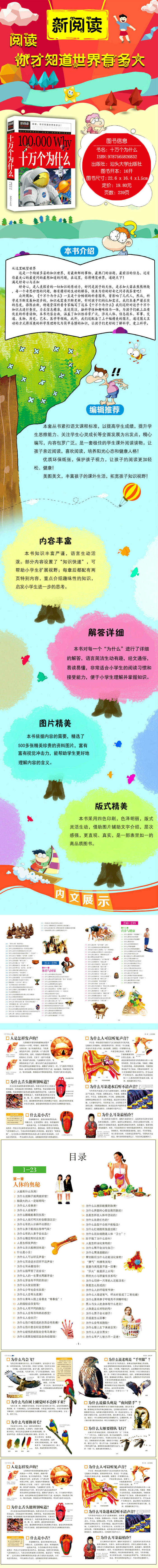 本书是一本适合儿童阅读的十万个为什么,收录了有关动物、植物、宇宙、地球、人体、社会、科技、军事、交通、体育、文化艺术等各方面孩子关注以及需要了解的有趣知识。文字浅显易懂,适合孩子独立阅读;大量精美的图片、照片带给孩子完美的视觉享受,是一本图文并茂的优秀儿童读物。