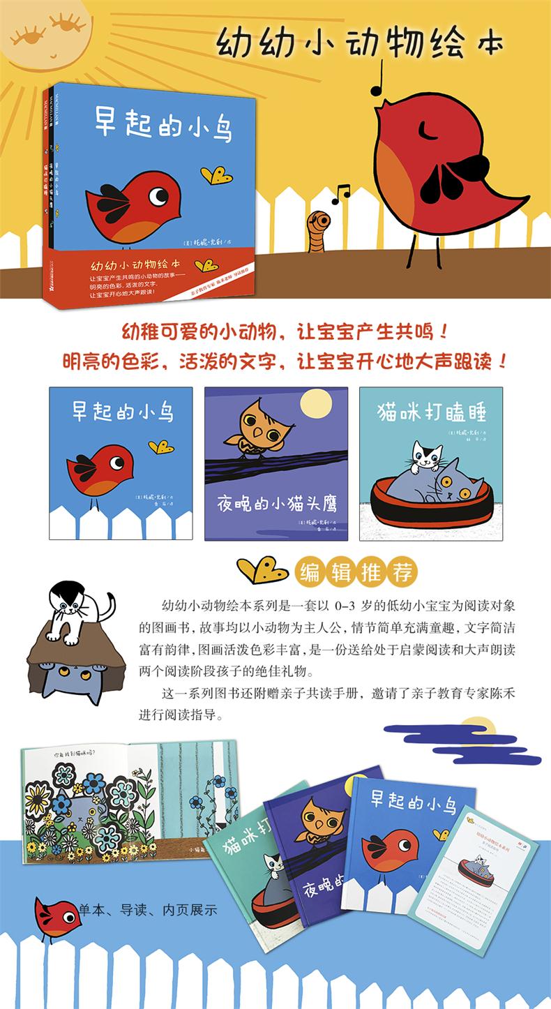 幼幼小动物绘本系列共含3册,分别为《早起的小鸟》《夜晚的小猫头鹰》和《猫咪打瞌睡》,描绘了三种可爱的小动物身上发生的充满童趣的小故事:早起的小鸟喜欢早早地起床,到花园里玩耍,和早起的小虫子一起吃早餐;夜晚的小猫头鹰听到各种声音,但它们都不是妈妈,最终小猫头鹰终于回到家见到了妈妈;猫咪困了想睡觉,但小猫想跟他玩捉迷藏,每一次小猫都能找到藏起来的猫咪。
