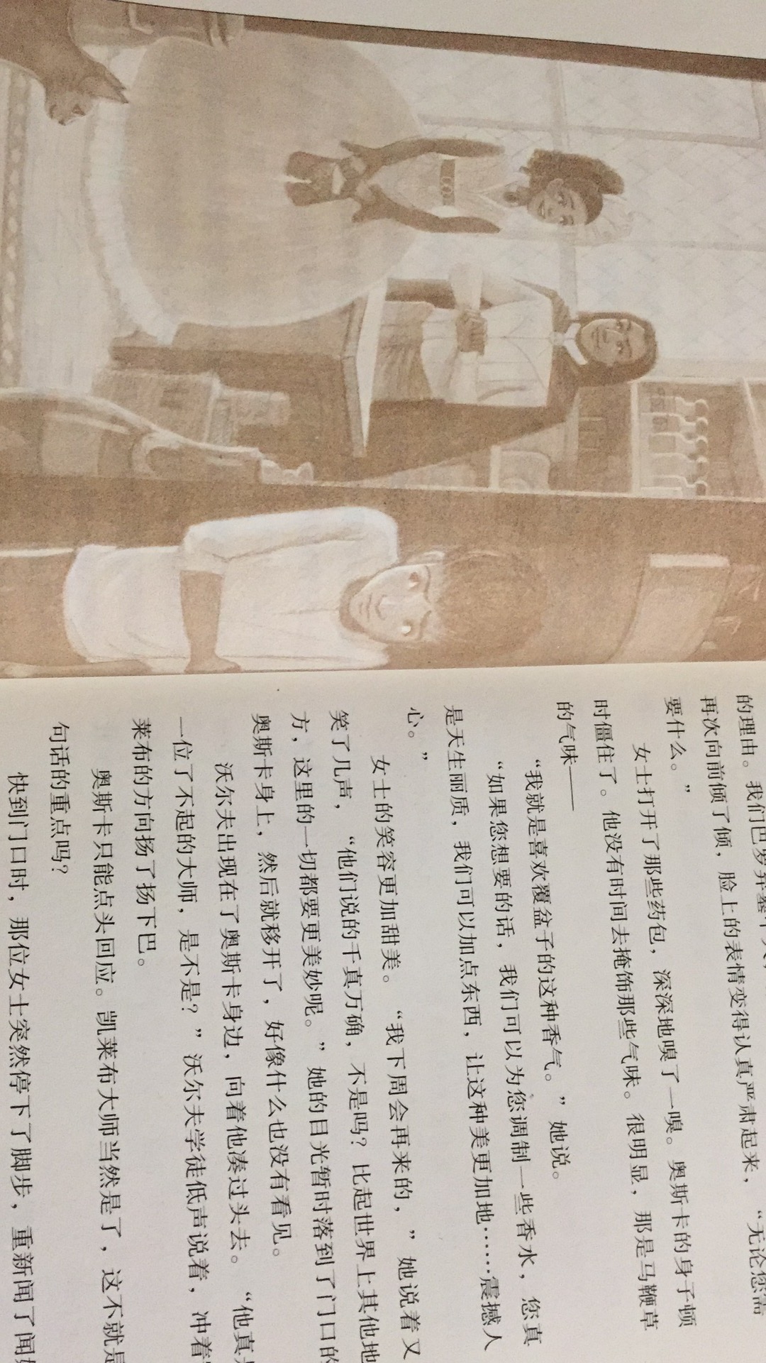“快出来,快出来,你个小老鼠!你在吗?”那个学徒的声音顺着地窖的台阶传了下来。刚一听到他的声音,角落里那只灰色的小猫就爬了起来,轻轻去蹭奥斯卡。“没事的,”奥斯卡低声说,“我不会有事的。”于是,这只小猫站起身来,消失在黑暗之中。