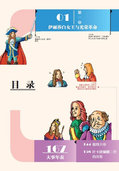 本书是《我的第一本世界历史知识漫画书》的第九册。讲述的是欧洲各国在君主制度下的发展。这些有作为的君主在不同的时代做出了许多可以载入史册的事情,这让他们成为一个被民众所喜欢的君主。英国伊丽莎白女王缔造了“黄金时代”,在经济、社会、宗教等方面使英国得到了长远的发展;法国的凡尔赛宫是一座闻名世界的建筑奇迹,而建造它的国王路易十四也和凡尔赛宫一起被世人铭记;俄国的彼得一世,锐意进取,扩张领土,被俄国人民尊称为彼得大帝,在他之后的叶卡捷琳娜二世也是一位有为君主,在她的主持下,俄国国势继续蓬勃发展。