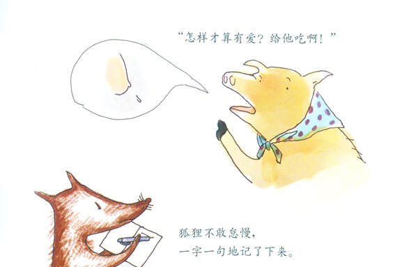 《葡萄》能够十分传神地以语言和绘画,描写出小狐狸可爱的天真性格,一个重要的原因在于,作者站在幼儿的立场,抓住了幼儿的逻辑。如果说,种葡萄要有爱,这还不是只有幼儿才会有的想法,那么,请教猪妈妈等人,通过忍住嘴馋而理解“爱是恒久忍耐”,恐怕就是幼儿特有的心思和理解事物的方式了。