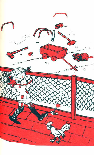 她头发的颜色像胡萝卜一样,两条梳得硬邦邦的小辫子直挺挺的竖着。她的鼻子长得就像一个小土豆,上边布满了雀斑。鼻子下边长着一张大嘴巴,牙齿整齐洁白。她的连衣裙也相当怪,那是她自己缝的。原来想做成蓝色的,可是蓝布不够,她不得不在这儿缝一块红布,那儿缝一块红布。她的又细又长的腿上穿着一双长袜子,一只是棕色的,另一只是黑色的。她穿一双黑色的鞋,正好比她的脚大一倍……