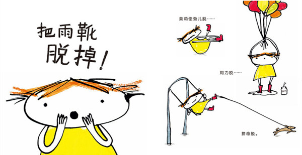 没有人可以让莫莉脱下雨靴或是换上别的鞋子。莫莉喜欢雨靴了,不管做什么、在哪里,她都穿着雨靴,就连睡觉时也不例外。有一天,她突然感觉脚趾的缝缝好痒好痒,她想挠却挠不着。莫莉试了好多方法,没有一个方法管用。终于,她意识到必须把雨靴脱下来……脱下雨靴的莫莉,依然喜欢雨靴吗?