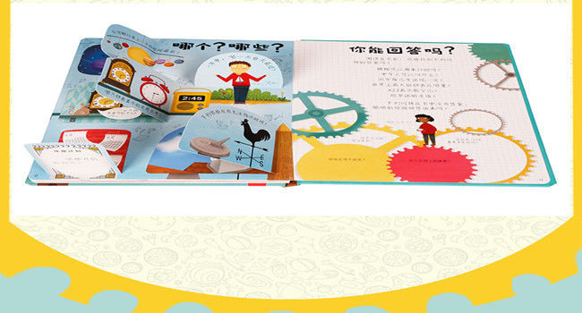 这本书可以让孩子和家长一起探讨各种各样与时间有关的问题。书中共有60多张翻页,每张翻页都设计了一个有趣的提问。家长可以让孩子先猜一猜,然后掀开翻页自己找答案。每册共设置了60多道问题,围绕孩子*感兴趣的知识展开,如什么是时间,动物能感知时间吗?谁创造了时间等等。